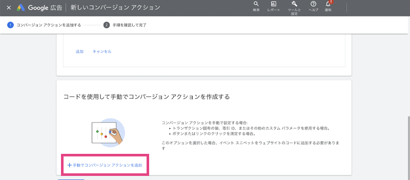 スキャンするとコンバージョンアクションの作り方が2種類出てきますが、今回は下の手動で作成で進めるので、「+手動でコンバージョンアクションを追加」をクリック