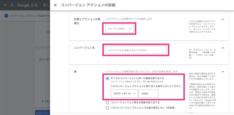 「コンバージョンアクションに割り当てる値」は明確な値段があればその値段を記入する。