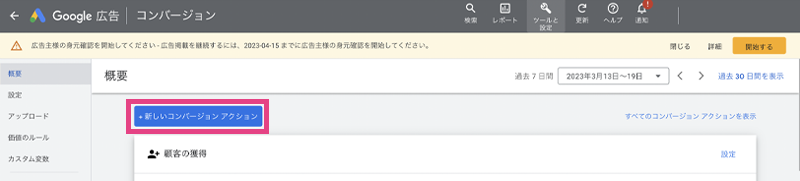 「+新しいコンバージョンアクション」のボタンをクリックする
