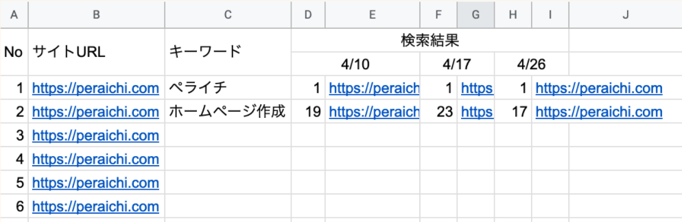 上の図は検索結果の順位を記録したエクセルの例です。