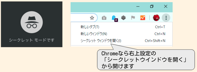 Google Chromeであれば、タブ右上から「シークレットウインドウを開く」を選択してシークレットウインドウを開きましょう。