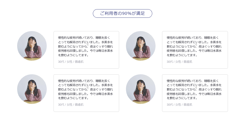 そこで今度は、その商品(サービス)を利用しているお客さまの生の声を見せて「こんなにいろんな人が良いと言っているのだから、私も申し込むべきよね!」と背中を後押ししてあげましょう。