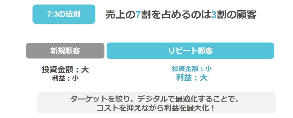売上の7割を占めるのは3割の顧客、つまりリピーターをいかに定着させるかが利益拡大の重要なポイントということです。