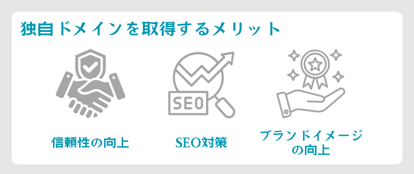独自ドメインを取得することで、信頼性の向上・SEO対策・ブランドイメージの向上など、3つのメリットがあります。