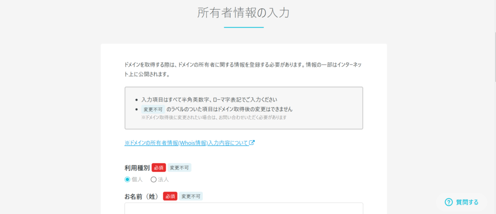 ドメインの登録情報は第三者が確認できる状態で公開することが義務付けられているため、所有者情報の入力は必須です。