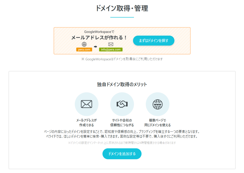 ここでは、ペライチでのドメインの取得・管理の手順をご紹介します。