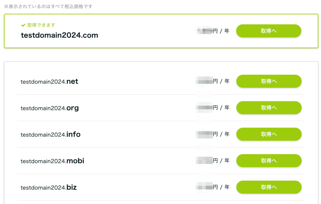 検索結果には、ドメインが取得可能かどうかと価格 (年間) が表示されます。