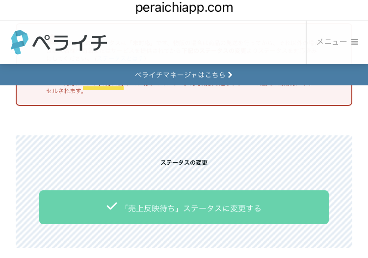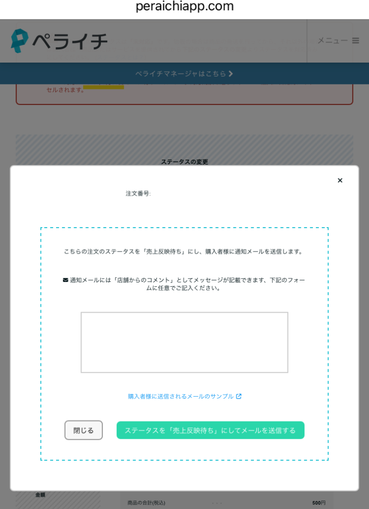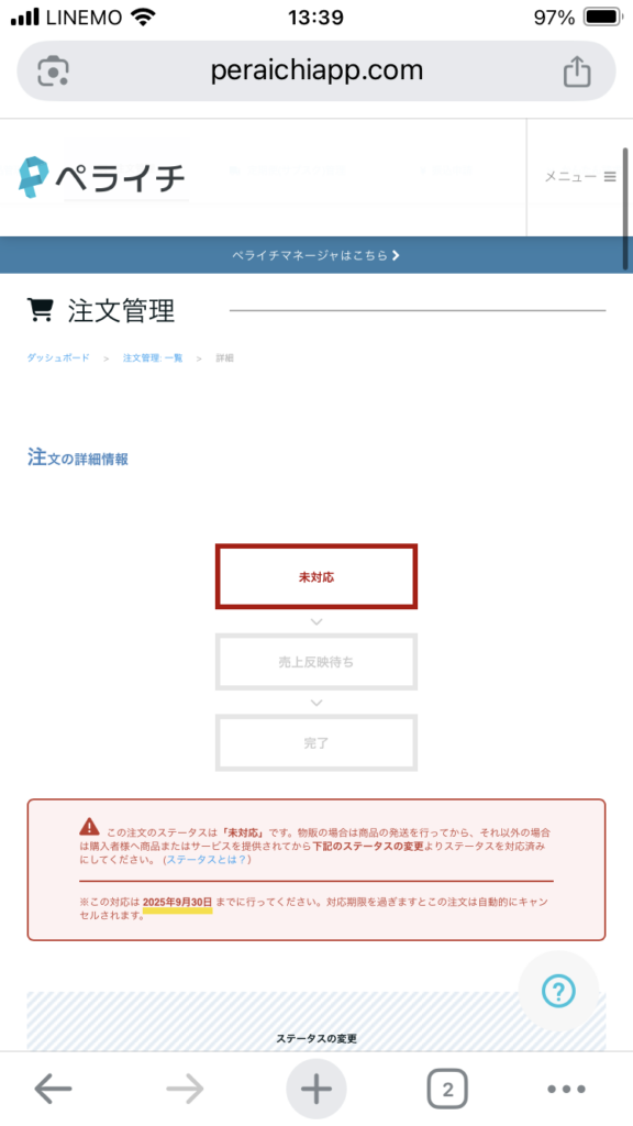 当日に注文が入ると、ペライチ決済の管理画面に「未対応」と表示されます。