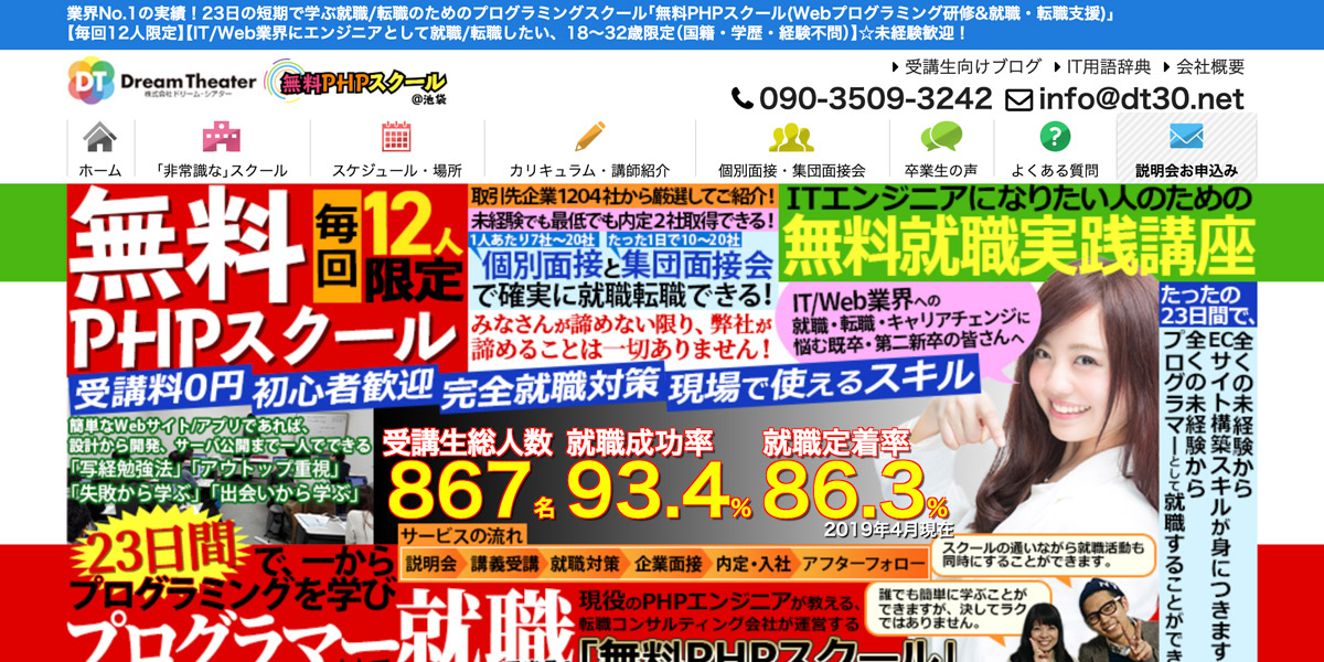 | 無料PHPスクール | PHP、JavaScript、HTMLなど | 通学(池袋) | プログラミング初心者 |