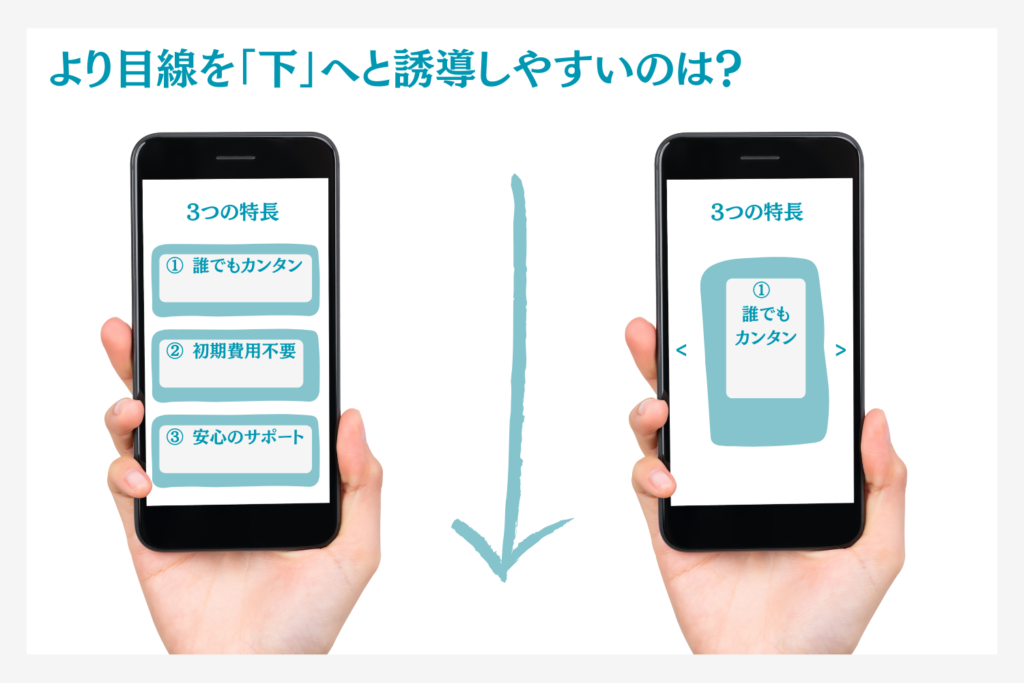 スマートフォンなどのモバイル端末での閲覧が多い場合は、目線の動きを意識して要素を配置するのが効果的です。ターゲットに特定の行動を促すCTAのブロックへ誘導するためには、ページの途中で離脱せず、最後まで読み進めてもらうことが必要です。例えば、「3つのポイント」は横並びではなく縦に並べるなど、目線を縦に誘導することを意識すると効果的です。