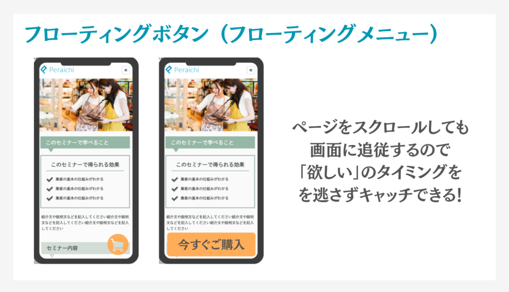 その他、画面の下側や上側に常にボタンが追随する「フローティングボタン」なども活用して、ターゲットが購入したい、申込みたいと思った時にすぐにアクションを起こせるような導線を確保しましょう。