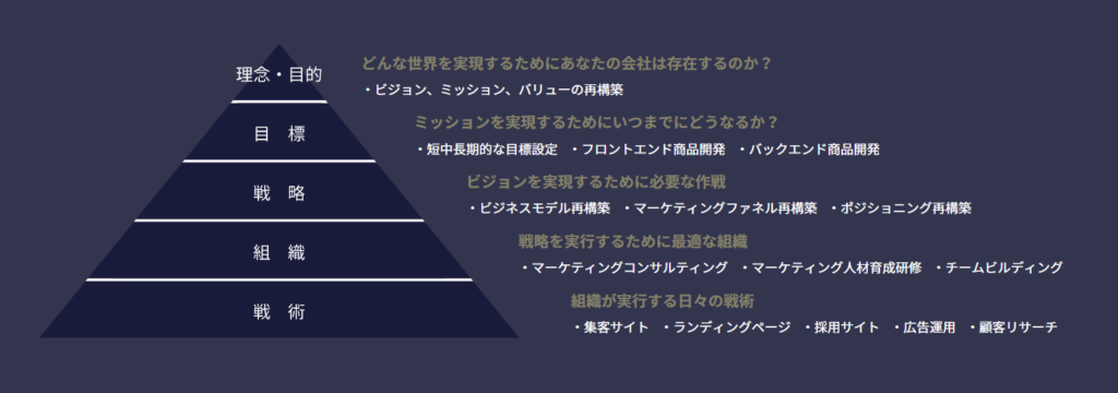 元々はWeb制作会社としてスタートした当社ですが、現在はマーケティング戦略の構築からコーチングまで、幅広くご支援を行っています。クライアントさまのビジネス課題を本質的に解決するためには、企業理念やビジネスモデル、人材育成にまでより広くサポートさせていただく必要があるため、自然とそのような形になりました。