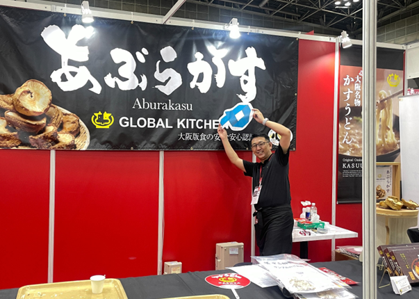 卸売事業の販路拡大にあたり、世間一般的にイメージが定着しているかすうどんの「加寿屋 (KASUYA) 」としてではなく、「株式会社グローバルキッチン」として販売したいと考えました。そのための情報収集をしていたところ、展示会でペライチのブースが目に入りました。