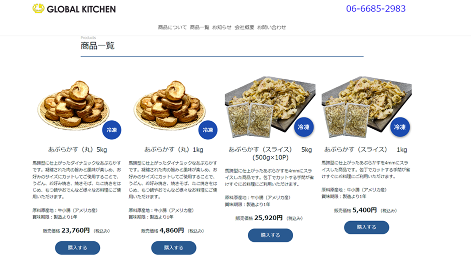 ▲ グローバルキッチンさんが運営するネットショップ (ペライチを使用して作成)