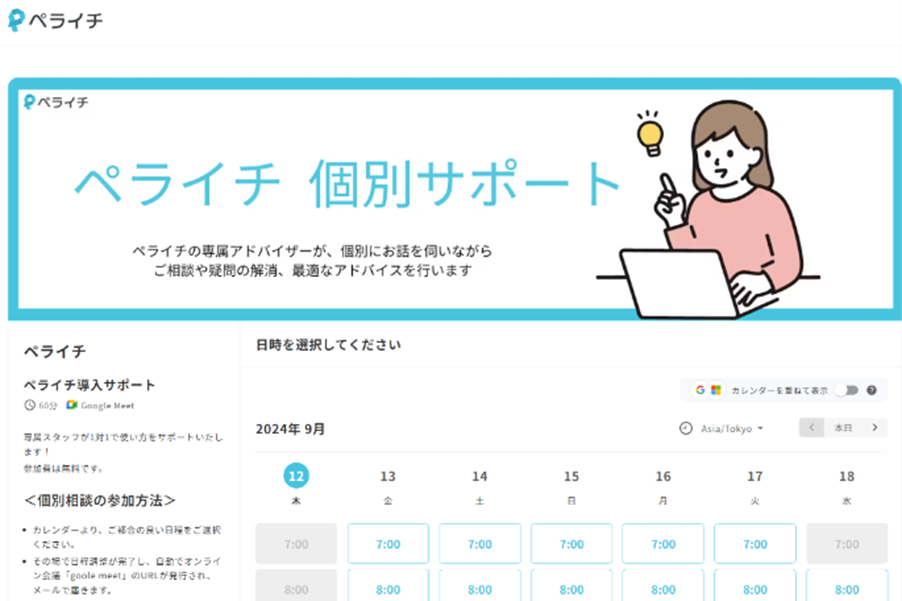 ▲スタッフが1対1で使い方をサポートするペライチの「個別サポート」。7時から22時まで、土日でも相談が可能。