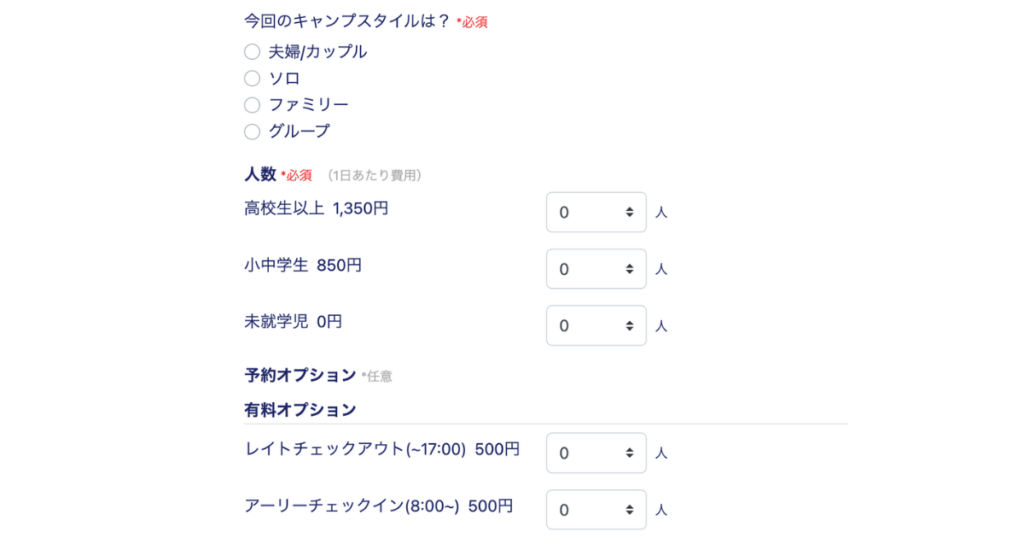 やりたいこととしては、予約時にサイト料金・人数に応じた料金設定を自動で算出し、事前決済もしくは現地で支払いを選択できるようにすることです。