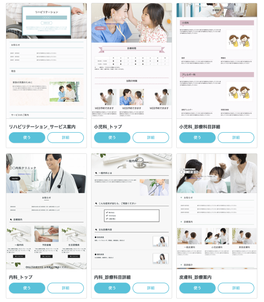 ▲ペライチで利用できるテンプレート。病院やクリニックのホームページなど、医療分野に特化したものも多数ご用意。