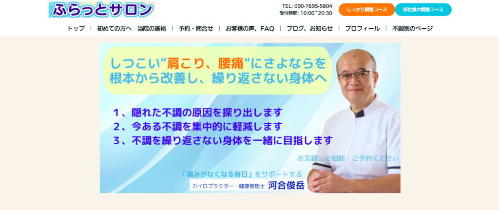 栃木県河内郡に店舗を構える骨格矯正カイロプラクティック院「ふらっとサロン」を運営。丁寧なカウンセリングと検査を通して根本原因を探り、年齢に関係なくどんな方でも改善を目指す。施術だけでなく、日常生活での改善点もアドバイスしている。