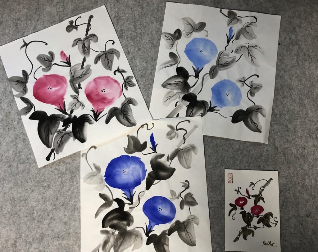 ▲レッスンで絵描く季節の花。墨と筆、半紙があれば気軽に始められます。