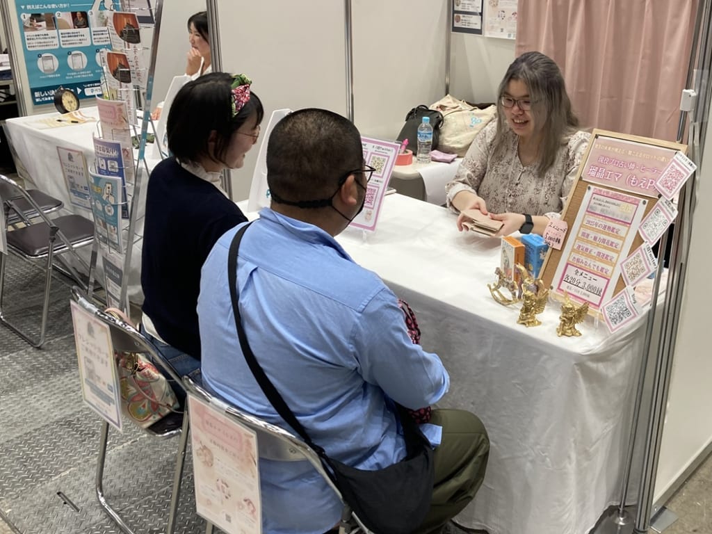 ▲ 瑠晶エマ (もえP) 先生による貴重な対面セッション。椅子の背もたれにチラシを貼りつけることで、通路からでも鑑定内容が分かりやすい。
