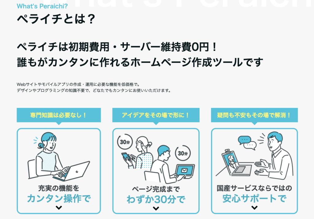 「ペライチ」は、3ステップの簡単操作で、誰でも簡単にランディングページを作成できるサービスです。