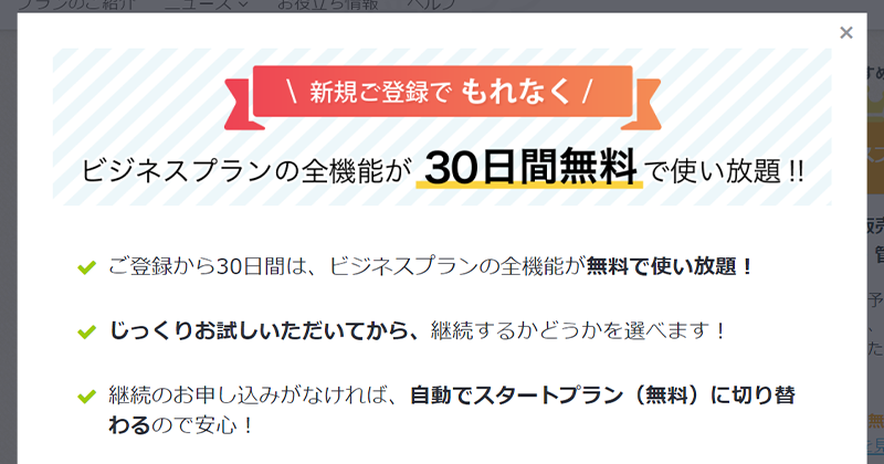 ペライチでは初回登録時、30日間無料ですべての機能が使える「ビジネスプラン」をお試しすることができます。