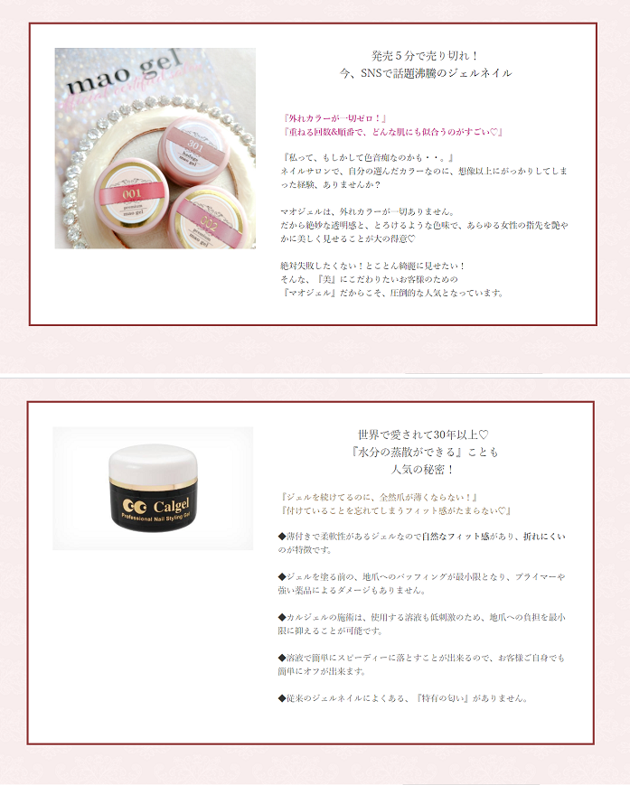 メニュー表やデザインなどの一般的な項目だけでなく、使用するネイル製品についても詳しく説明を掲載。