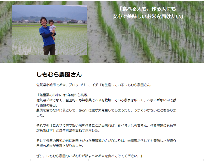 基本のテンプレートから必要な要素を抜き出したシンプルな作りではありますが、こだわりの無農薬栽培米の魅力が十分に伝わるページとなっています。