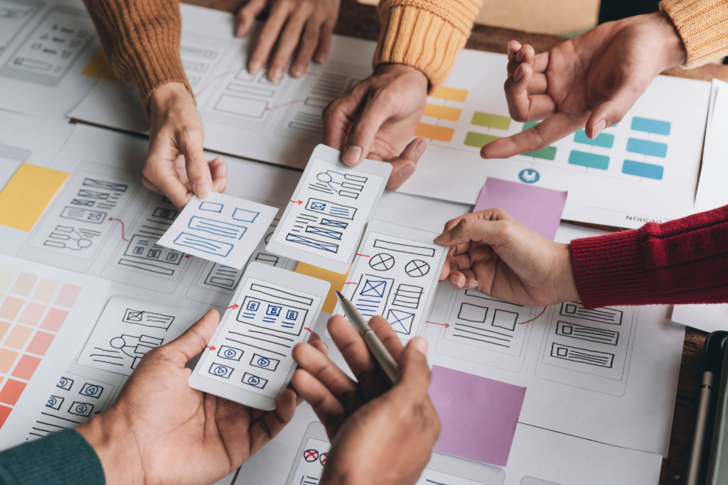 その後、UX/UIデザイナーやWebデザイナーが、実際に紙やツールを使ってワイヤーフレームを作成。