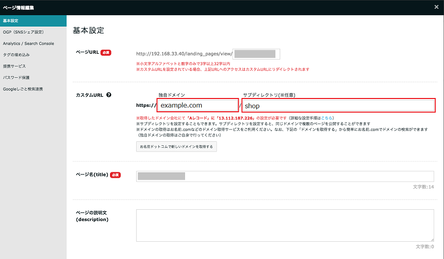 2.「基本設定」というタブが出てくるので、「カスタムURL」の「ドメイン」に取得したドメインを入力。さらに、「サブディレクトリ」に使用したいサブディレクトリ名を入力します。サブディレクトリの名称に決まりはないので、任意の入力でOKです!