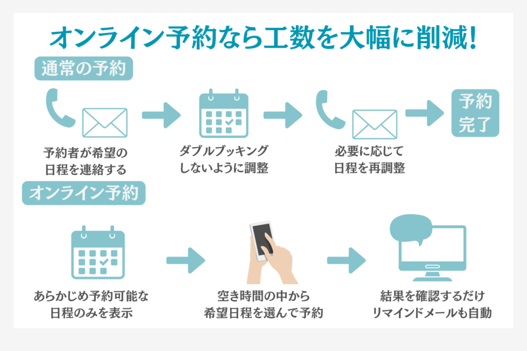 オンライン予約システムを導入することで、予約の受付を24時間・365日自動で受け付けることができます。必要に応じてキャンセル処理やお礼メール、リマインドメールなどの周辺業務も自動化することが可能です。