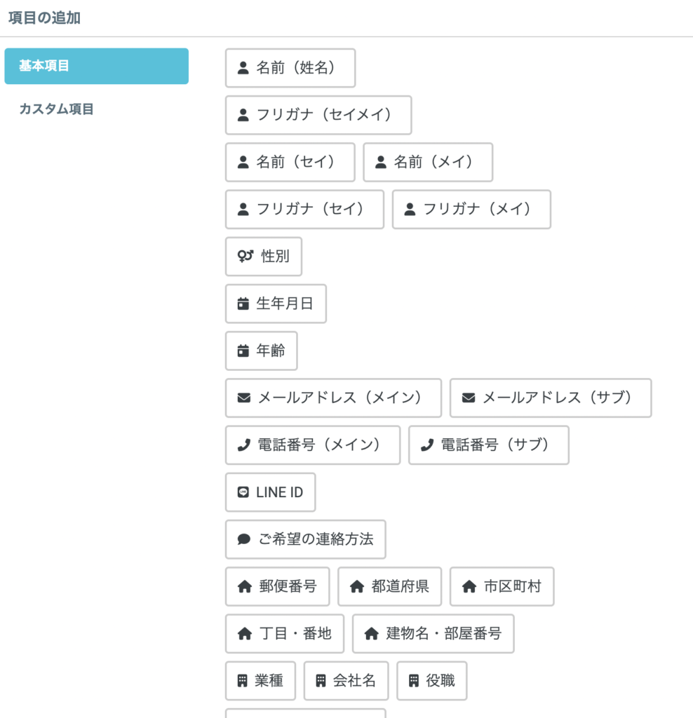 基本項目とカスタム項目からお好きな項目を選択してフォームを編集しましょう。