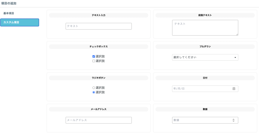 - プルダウン: プルダウンで複数の選択肢を表示して選択できる項目