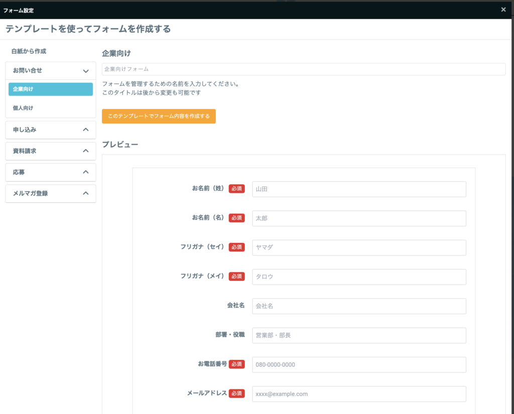 - テンプレートから選択するだけで面倒な資料請求フォームもワンクリック作成