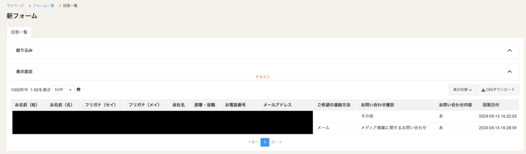 - フォーム受信内容を一括管理・CSVダウンロードが可能
