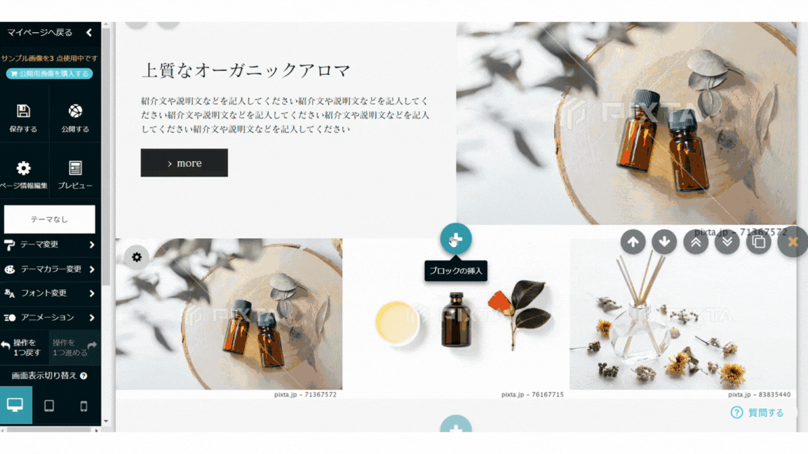 ページの編集画面を開き、商品購入ボタンを設置したい場所にブロックを挿入します。