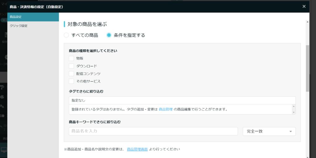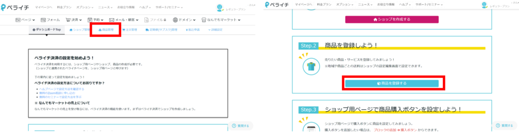 ペライチ上で販売する商品・サービスの情報を登録します。商品の種類や商品名・販売価格・在庫数などの設定が出来ます。