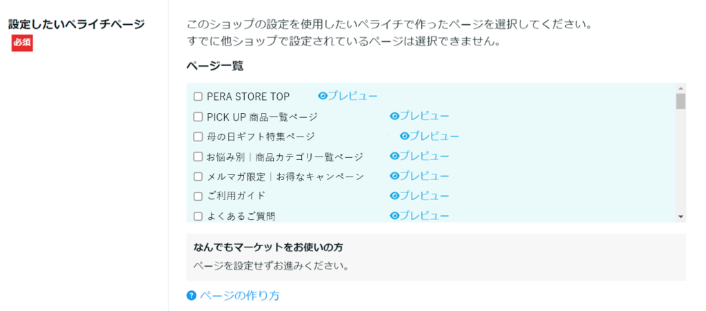 「設定したいペライチページ」の項目で、決済機能を利用したい (購入ボタンを設置したい) ページを選択します。選択したページに対してショップの設定が適用されます。