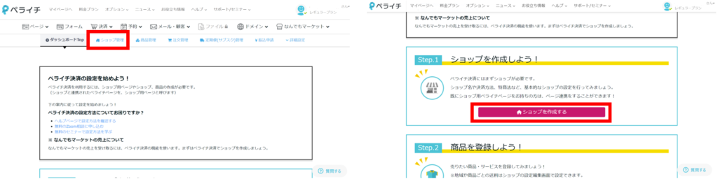 ダッシュボードTOPの「ショップを作成する」ボタン、もしくは上部メニューの「ショップ管理」を選択し、画面の案内に従って必要情報を入力しましょう。